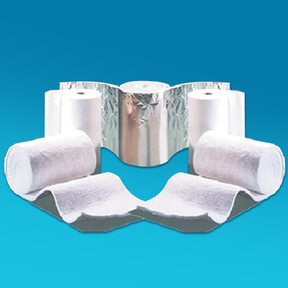 云緯覆鋁箔針刺毯是在現(xiàn)有陶瓷纖維計(jì)刺毯的基礎(chǔ)上利用專用機(jī)械,通過專用粘結(jié)劑將金屬鋁箔平整地覆到針刺毯表面形成的一種復(fù)合產(chǎn)品。由于在針刺毯表面增加了一層致密 的金屬鋁箔層,有效屏蔽了熱量透過纖維毯向空氣的對流,對輻射熱量形成有效反射,從而極大地提高了產(chǎn)品的絕熱性能。